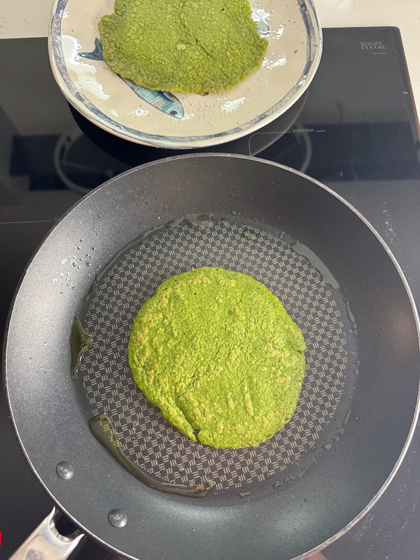 Once the pan is hot, add a little of the mixture and spread it over the pan by tilting the pan at different angles. Cook for around 4-5 minutes on each side.