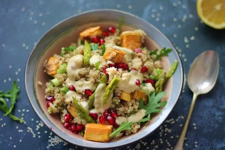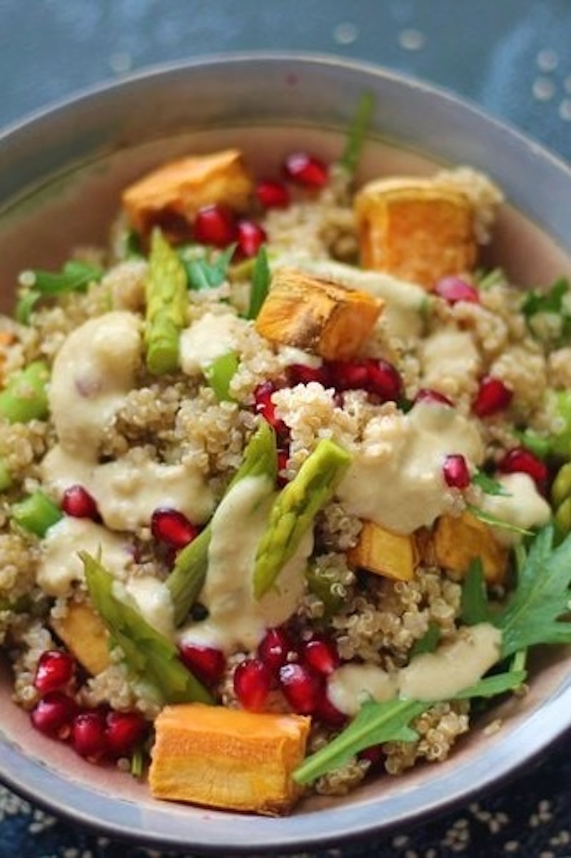 Place a bed of rocket in a salad bowl. Add the quinoa, the sweet potato cubes, the asparagus pieces, the spring onion, the avocado, and the nutritional yeast.